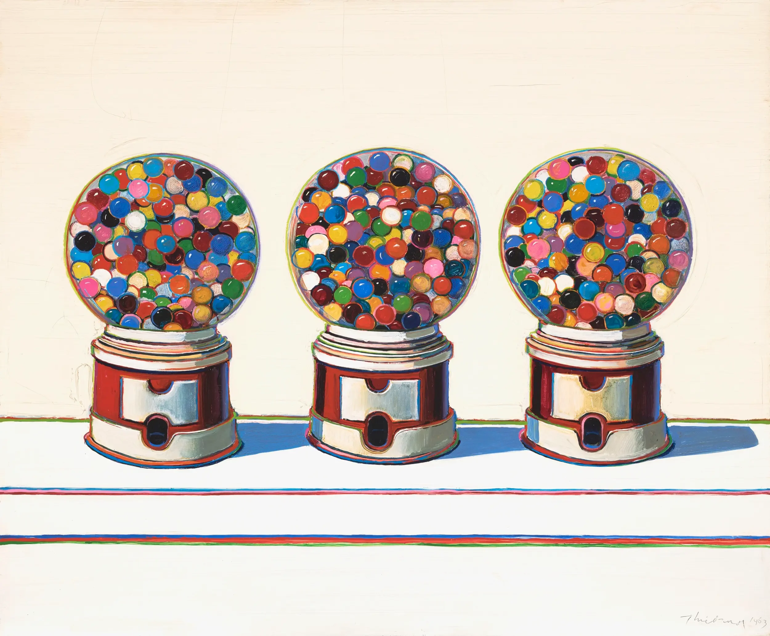 Thiebaud sensed that he was onto something by merging the European still-life tradition with a uniquely North American brand of nostalgia but was unsure of the validity of his subject matter. Nevertheless, he continued to hone his approach to color and composition while testing the tactile possibilities of oil paint, exalting these products from their quotidian existence into something close to sacred.